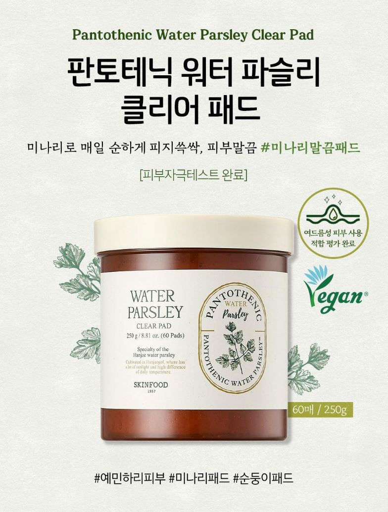- Water Parsley Clear Pad: Fresh-feeling essence with a lightweight glide (60 pads / 250 g)